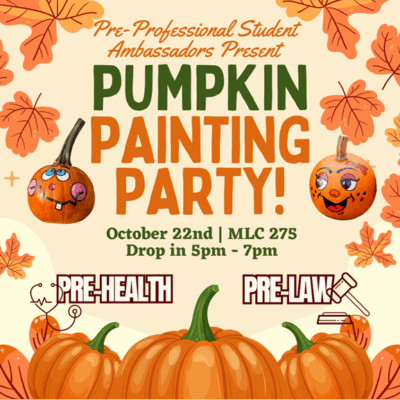 Are you pre-health or pre-law? Stop by for a seasonal craft and refreshments with your pre-professional peers at the Pumpkin Painting Party, October 22nd between 5:00 p.m. and 7:00 p.m. at MLC 275. Hosted by the Pre-Professional Student Ambassadors.