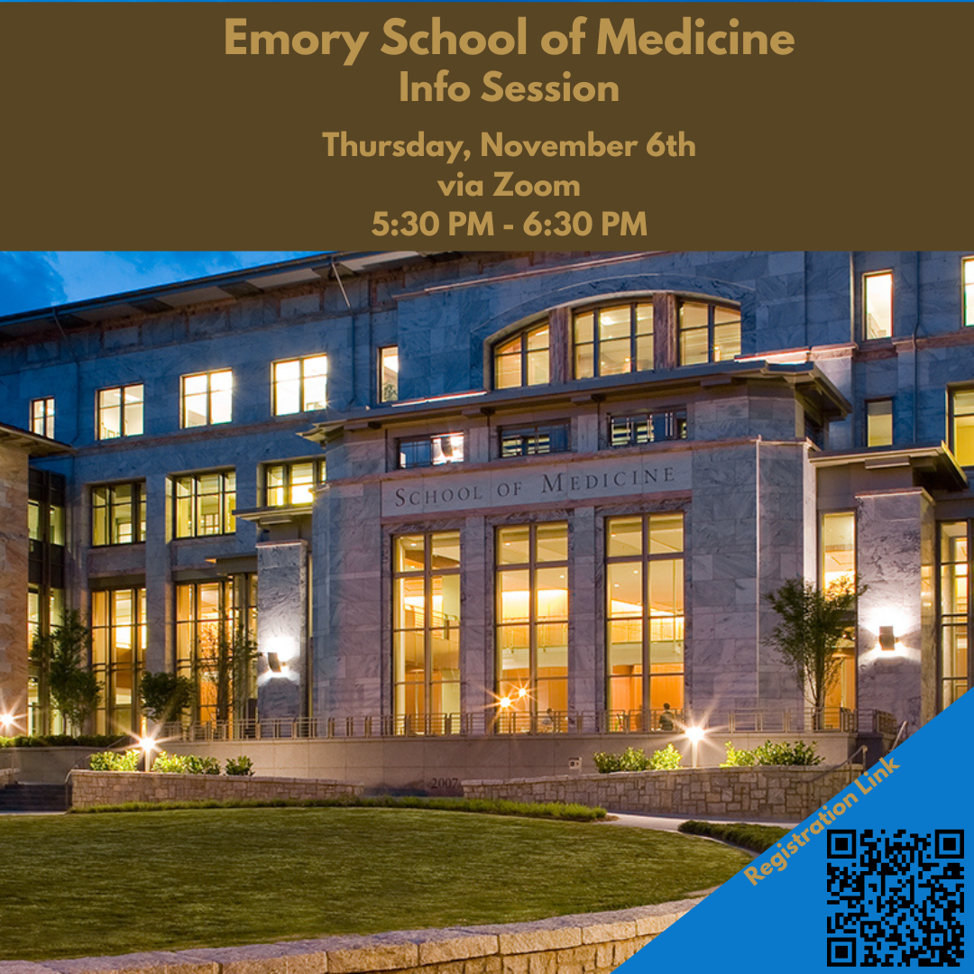 Are you applying to Emory School of Medicine in the 2026 or 2027 Application cycles? If so, please attend an information session via Zoom on Thursday, November 6th, from 5:30 PM to 6:30 PM. Attendees will hear a presentation from the admissions office and will then be able to ask questions about the admissions process.