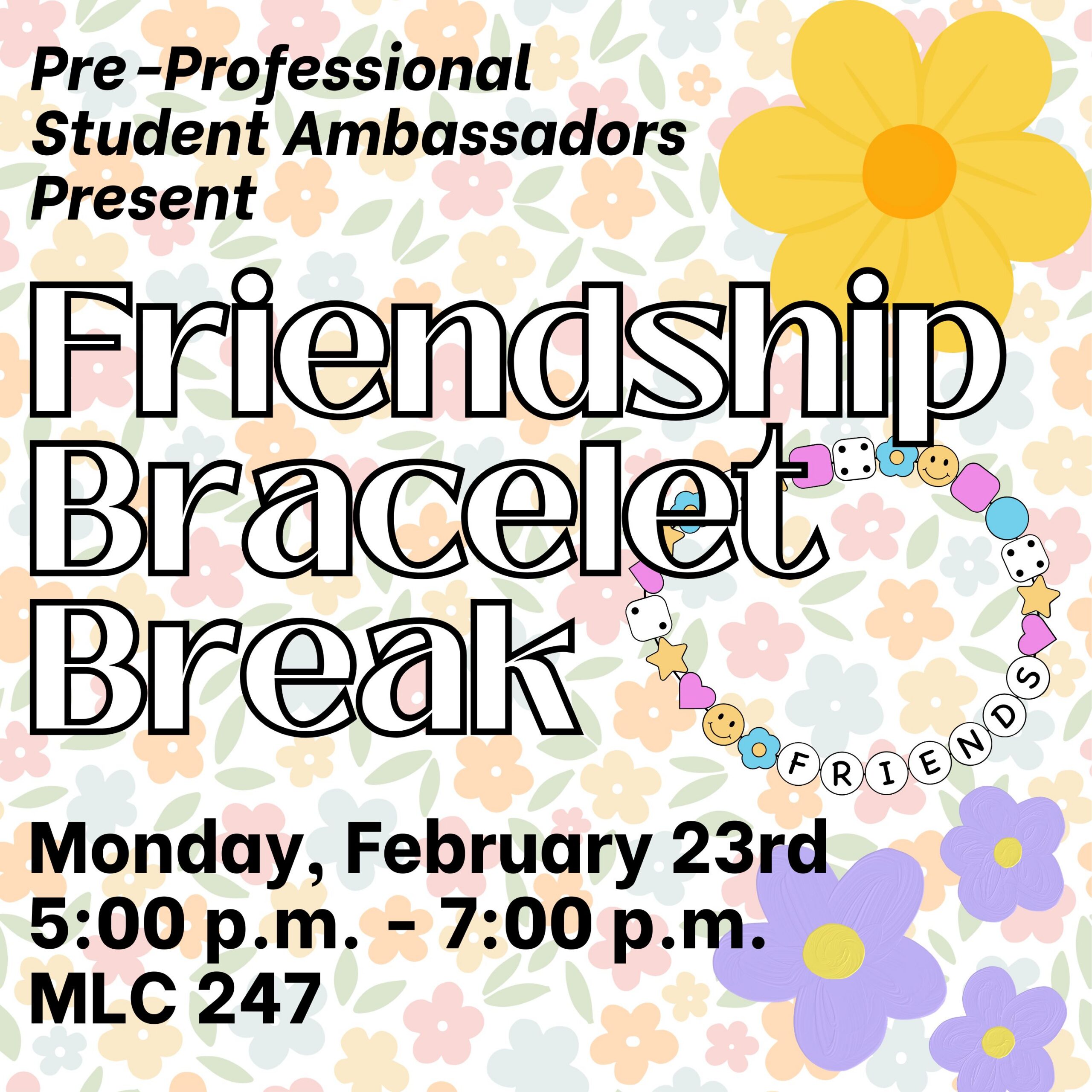 Are you pre-health or pre-law? Take a break to make a friendship bracelet with your pre-professional peers at the Friendship Bracelet Break Monday, February 23rd between 5:00 p.m. and 7:00 p.m. at MLC 247. Hosted by the Pre-Professional Student Ambassadors.