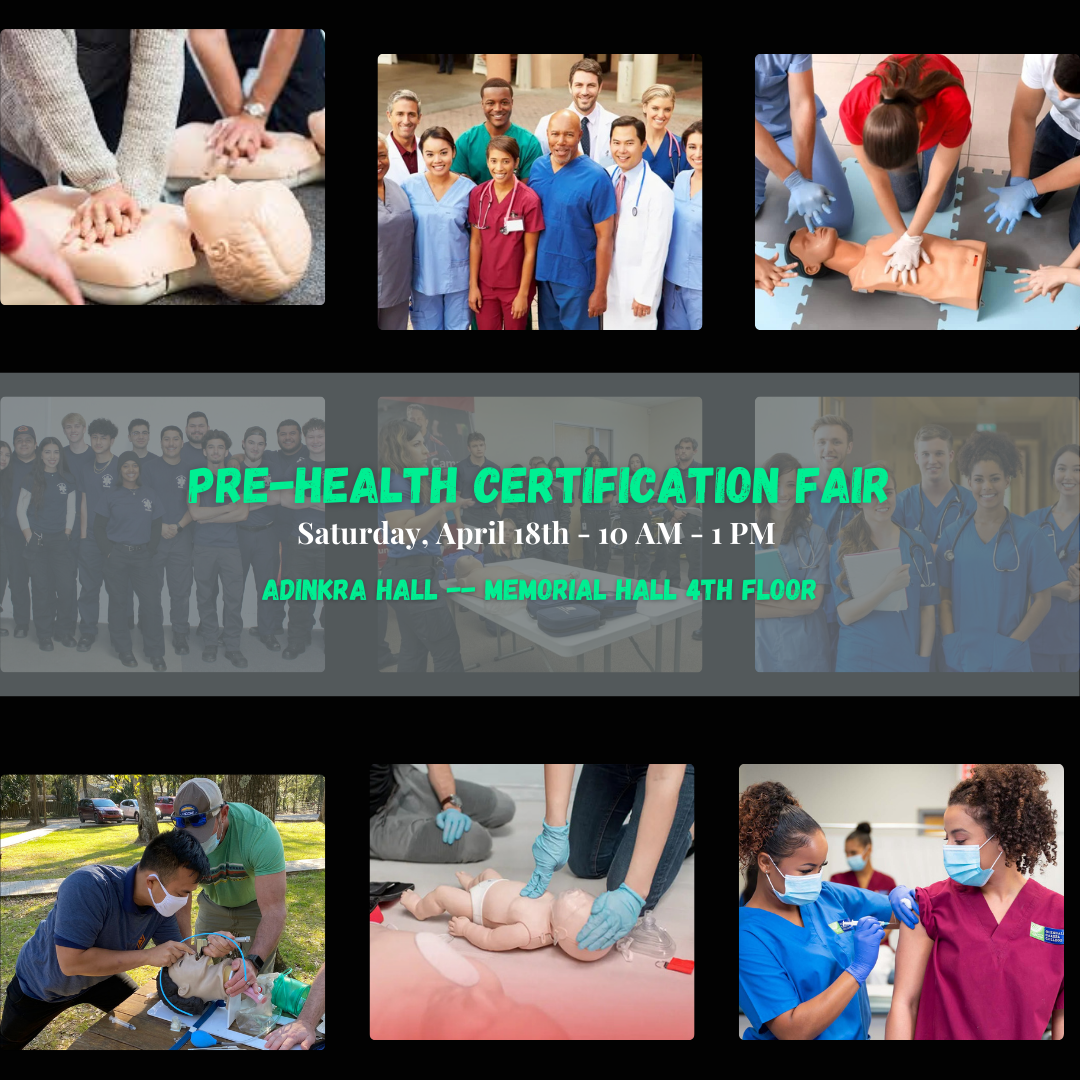 Do you need information about certification programs? Having a medical certification is a great way to gain clinical experience and patient care hours. Please attend the Pre-Health Certification Fair on Saturday, April 18 from 10 AM – 1 PM in Adinkra Hall in Memorial Hall – 4th Floor. Our community partners will present information about their certification programs. Attendees will gain knowledge about what it takes to become a medical assistant (MA), certified nursing assistant (CNA), phlebotomist, EKG technician, patient care technician (PCT), emergency medical technician (EMT), and how to get CPR/BLS training.