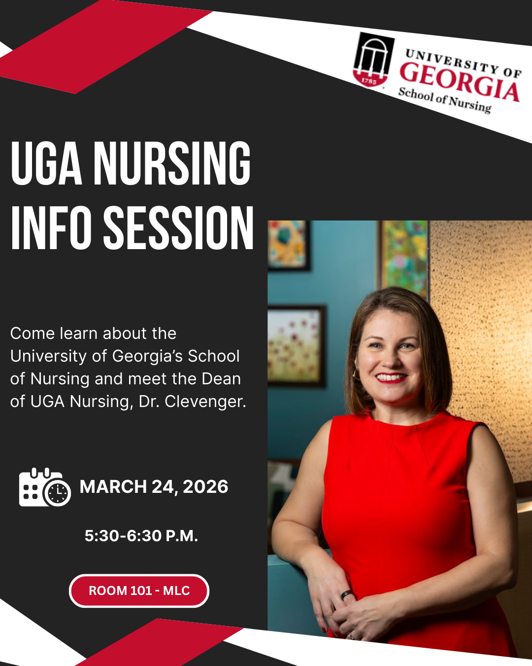 Join the Pre-Professional Advising Office on Tuesday, March 24th from 5:30–6:30 PM in room 101 of the Miller Learning Center to meet Dr. Clevenger and learn more about the University of Georgia’s new School of Nursing and its upcoming program.